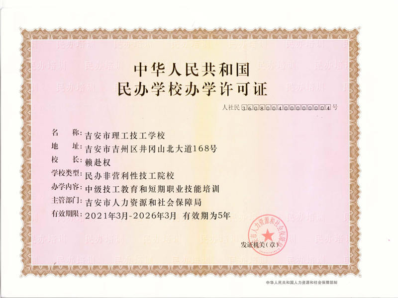 吉安市理工技工學校是經(jīng)吉安市人力資源和社會保障局批準設(shè)立的一所全日制技工學校,學校坐落在歷史文化名城吉安市中心城區(qū),毗鄰吉安市廬陵文化生態(tài)園,環(huán)境優(yōu)美,交通便利。