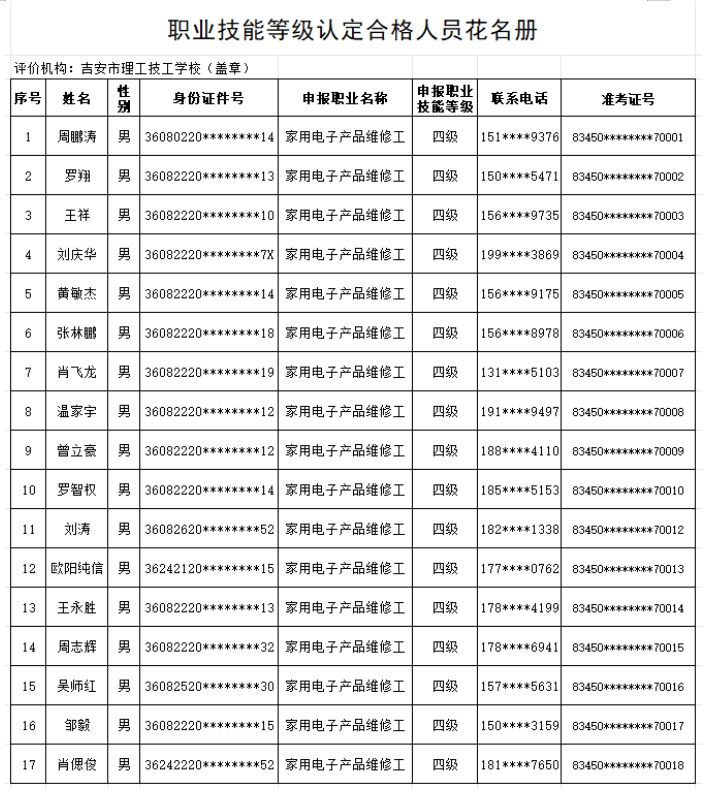按照《贛人社規(guī)【2022】7號(hào)》文件精神。我校于2025年3月27日開(kāi)展了家用電子產(chǎn)品維修工等級(jí)認(rèn)定,共18人(四級(jí)),通過(guò)認(rèn)定考核17人。現(xiàn)對(duì)認(rèn)定考核合格人員進(jìn)行公示。(名單附后)