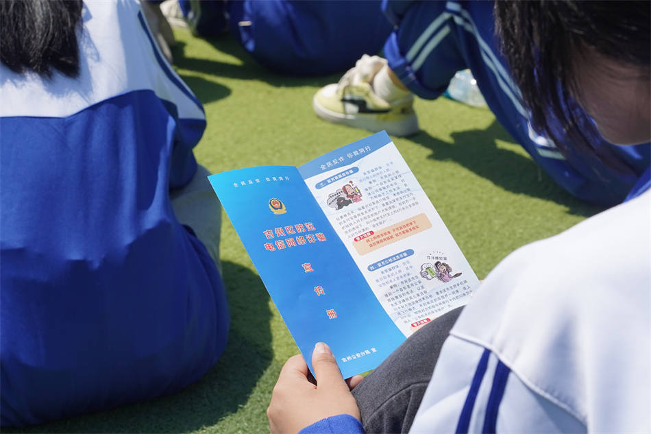 宣講間隙,民警們穿梭人群,將一份份圖文并茂的防詐宣傳單遞到學(xué)生手中。宣傳單上,各類詐騙方式用醒目標(biāo)題標(biāo)注,配合漫畫解析詐騙場景,成為同學(xué)們手中的“防詐指南”。