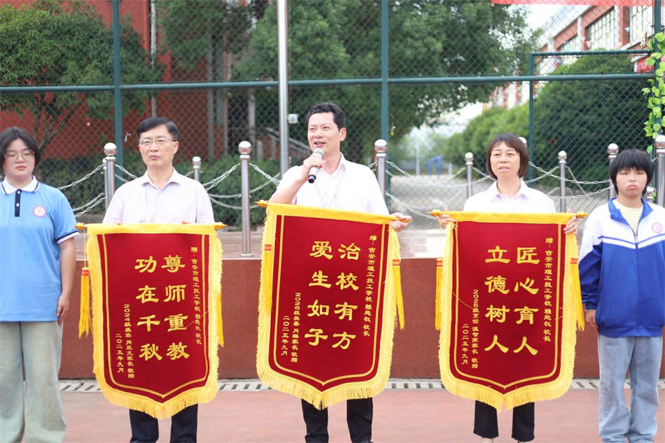 在拜師禮這一莊重環(huán)節(jié)圓滿結(jié)束后,現(xiàn)場迎來了一個特別的時刻—學(xué)生代表與家長代表共同走上臺前,向賴赴權(quán)校長贈送錦旗。錦旗上繡著“治校有方,愛生如子”等字樣,表達(dá)了學(xué)生對學(xué)校領(lǐng)導(dǎo)層辛勤付出的認(rèn)可與感激,也彰顯了家校共育的深厚情誼。