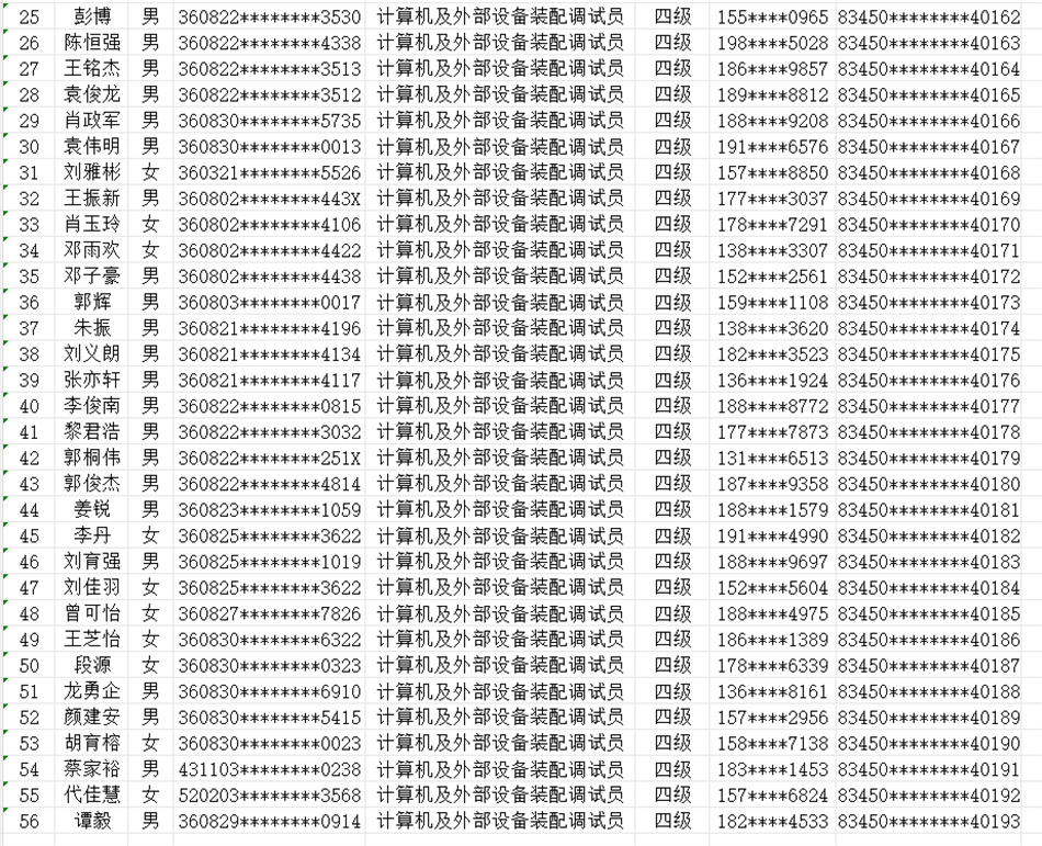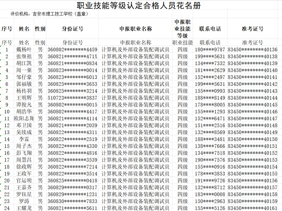 按照《贛人社規(guī)〔2022〕7號(hào)》文件精神。我校于2025年10月24日開(kāi)展了計(jì)算機(jī)及外部設(shè)備裝配調(diào)試員(計(jì)算機(jī)整機(jī)裝配調(diào)試員)等級(jí)認(rèn)定,共58人(四級(jí)),通過(guò)認(rèn)定考核56人?,F(xiàn)對(duì)認(rèn)定考核合格人員進(jìn)行公示。(名單附后)