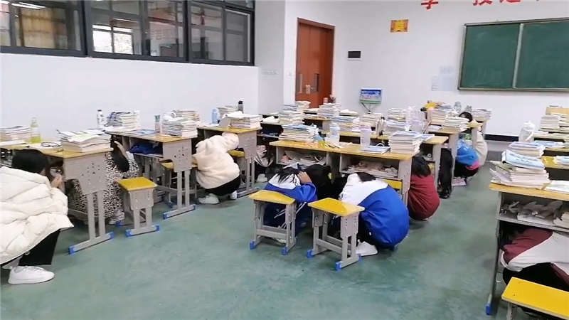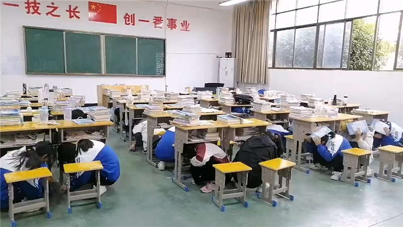 1、“地震警報”發(fā)出后,指導(dǎo)學(xué)生進行室內(nèi)避震,學(xué)生迅速抱頭,躲在各自的課桌旁,盡量蜷曲身體,降低身體重心,并盡可能用書包保護頭部,最后一排靠里的同學(xué)面向墻,蹲在墻角處。