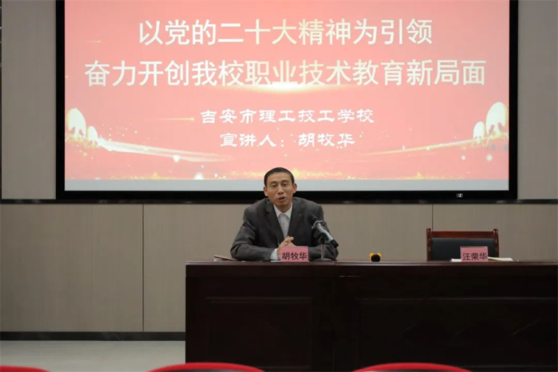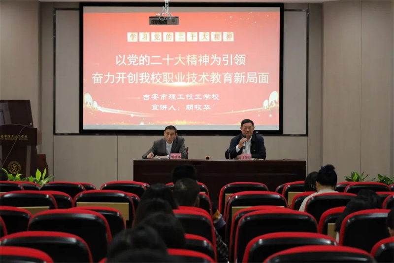 為深入學(xué)習(xí)宣傳貫徹黨的二十大精神,2022年11月28日下午,吉安市理工技工學(xué)校在校報(bào)告廳召開了學(xué)習(xí)黨的二十大精神宣講報(bào)告會(huì),校黨支部專職副書記胡牧華以《以黨的二十大精神為引領(lǐng),奮力開創(chuàng)我校職業(yè)技術(shù)教育新局面》為主題,為全校師生作專題宣講,執(zhí)行校長(zhǎng)汪榮華等學(xué)校相關(guān)領(lǐng)導(dǎo)及全體共產(chǎn)黨員、全校教職員工積極參與并且認(rèn)真聽取了報(bào)告會(huì)。