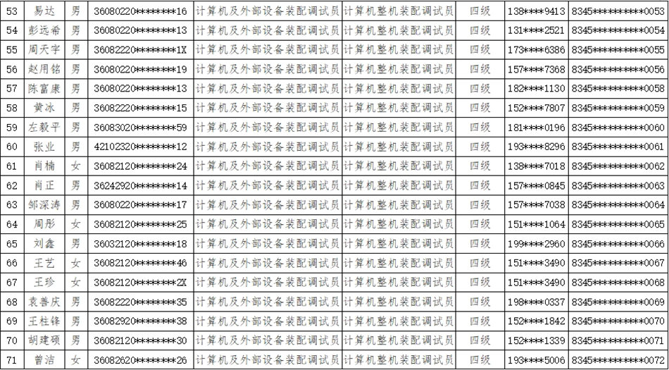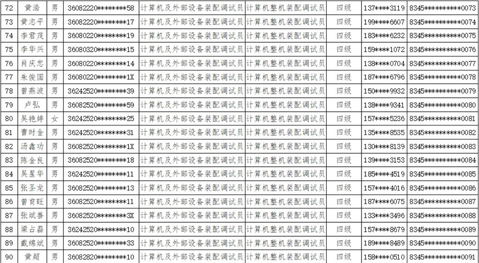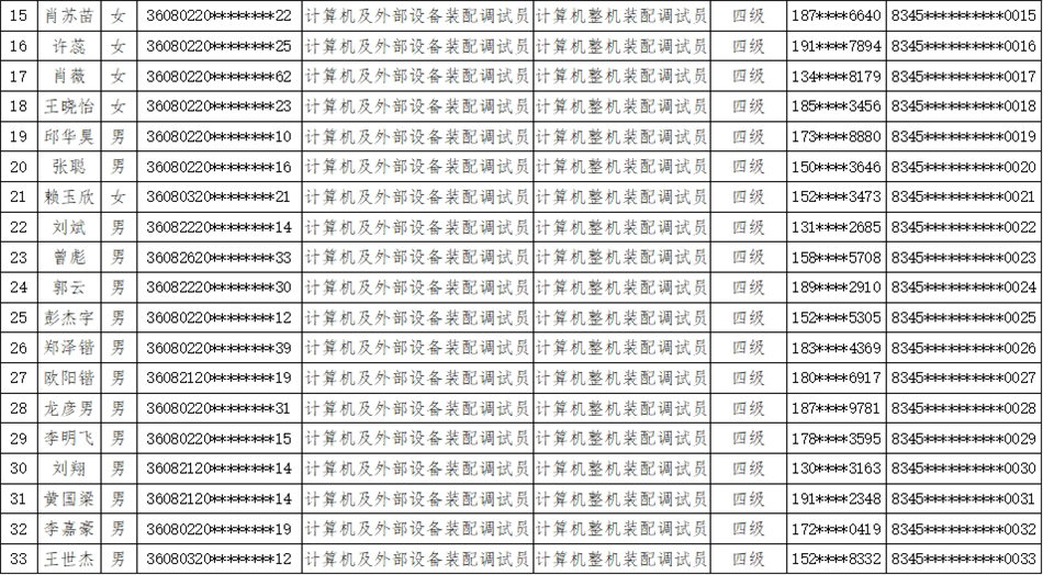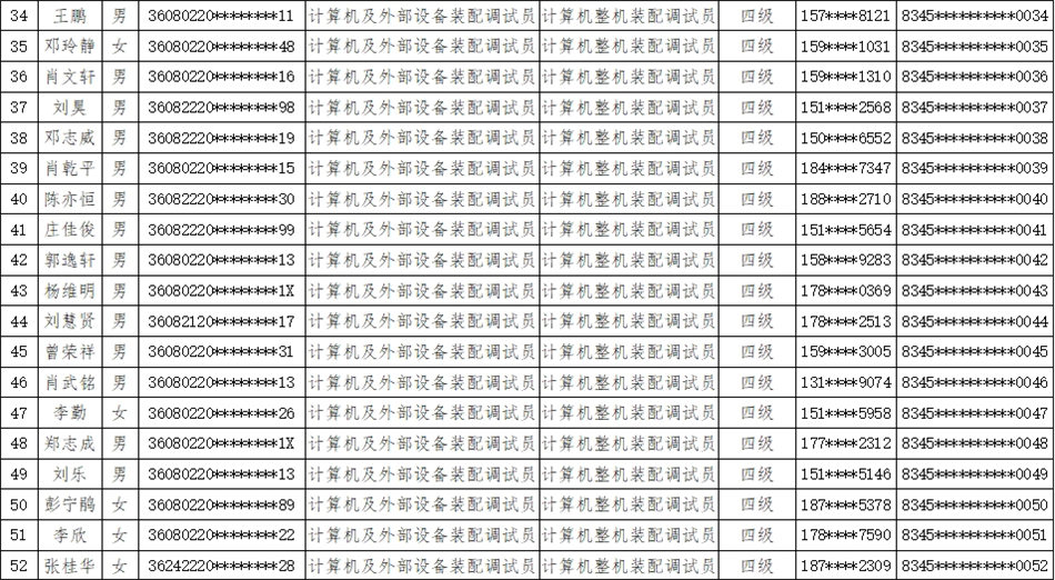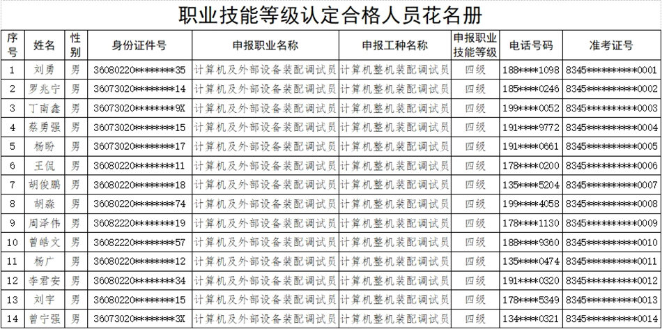 根據(jù)職業(yè)技能等級認(rèn)定組織實(shí)施規(guī)定,按照國家職業(yè)技能標(biāo)準(zhǔn),我校于2023年12月28日開展了計算機(jī)及外部設(shè)備裝配調(diào)試員等級認(rèn)定,經(jīng)理論知識考試和專業(yè)技能考核,現(xiàn)將認(rèn)定考核成績合格人員名單進(jìn)行公示,詳見附件。