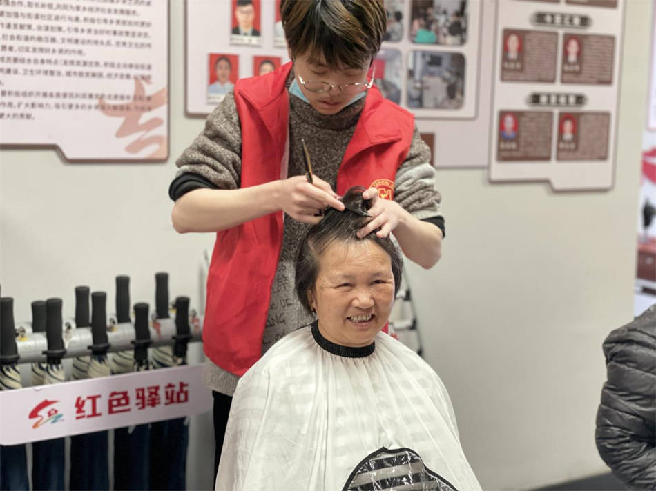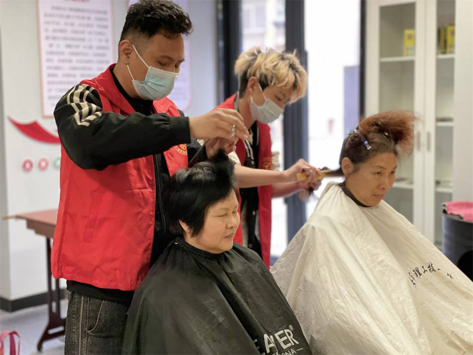 志愿者們?cè)缭缇蛠?lái)到社區(qū)做準(zhǔn)備工作,為老年人提供理發(fā)服務(wù),社區(qū)工作人員和黨員志愿者則負(fù)責(zé)維持現(xiàn)場(chǎng)秩序,并做好登記工作。