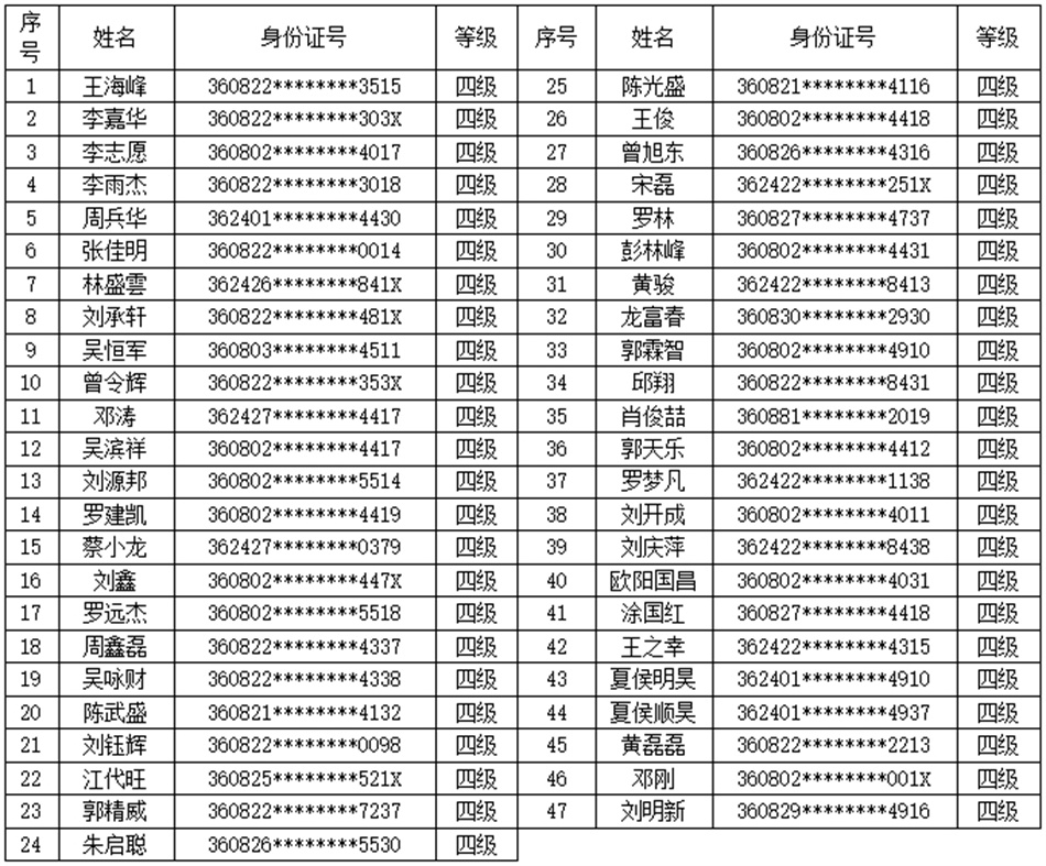 根據(jù)《江西省人力資源和社會保障廳關(guān)于遴選備案職業(yè)技能等級認(rèn)定社會培訓(xùn)評價組織的通知》(贛人社字(2020)302號)、《江西省人力資源和社會保障廳關(guān)于公布江西省第二批職業(yè)技能等級認(rèn)定社會培訓(xùn)評價組織的通知》(贛人社字(2022)128號)文件要求。按照《關(guān)于開展“互聯(lián)網(wǎng)+職業(yè)技能等級認(rèn)定”試點工作的通知》(贛人社字〔2020〕397號)精神。我校于2024年4月15日開展了汽車維修工(汽車維修檢驗工)等級認(rèn)定,共48人(四級),通過認(rèn)定考核47人。現(xiàn)對認(rèn)定考核合格人員進(jìn)行公示(名單附后)。