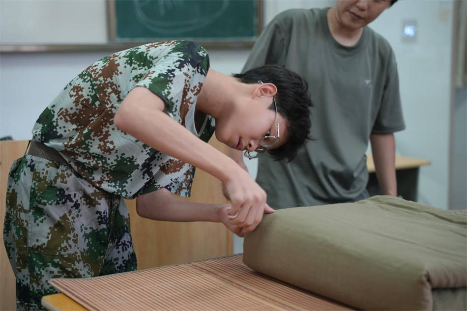 晨光中的初體驗:當?shù)谝宦暺鸫蔡杽澠茖庫o的校園,新生們從美夢中醒來,迅速整理起內(nèi)務,他們或蹲或跪,手指在薄被上輕輕按壓,細心調(diào)整每一個褶皺,直到被子呈現(xiàn)出完美的棱角,被疊成棱角分明的“豆腐塊”,牙刷杯、毛巾整齊劃一地擺放在洗漱臺上。這些看似微不足道的細節(jié),卻是軍訓生活紀律性的最初體現(xiàn)。
