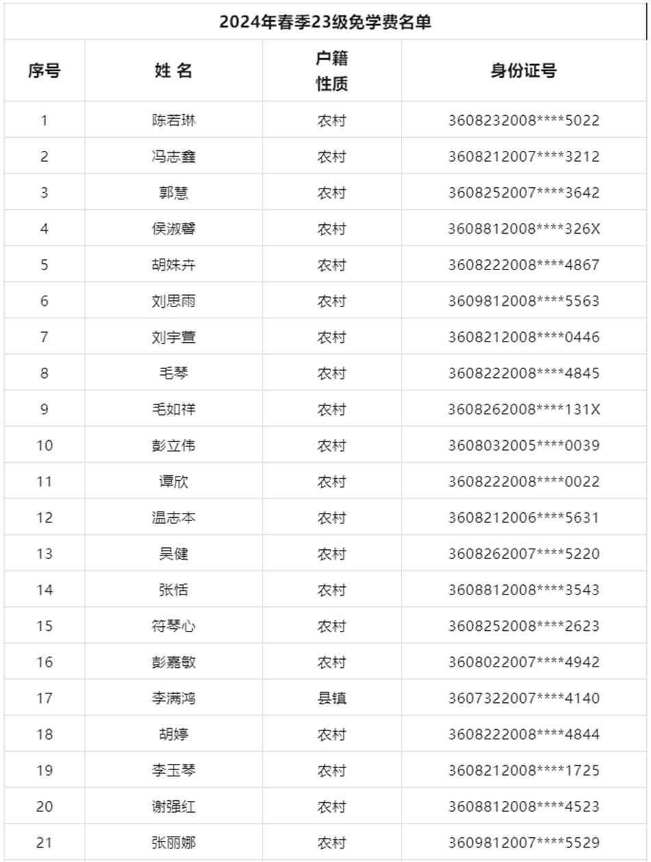 2024年春季學(xué)期我校21級(jí)學(xué)生免學(xué)費(fèi)申報(bào)526人,22級(jí)免學(xué)費(fèi)申報(bào)394人,23級(jí)免學(xué)費(fèi)293人,22級(jí)助學(xué)金143人,23級(jí)助學(xué)金90人,具體申報(bào)名單見(jiàn)以下,公示日期為4月2日至4月12日。如有疑問(wèn)請(qǐng)于公示日期內(nèi)向校紀(jì)檢監(jiān)察室或省人力資源和社會(huì)保障廳職業(yè)能力建設(shè)處反映。